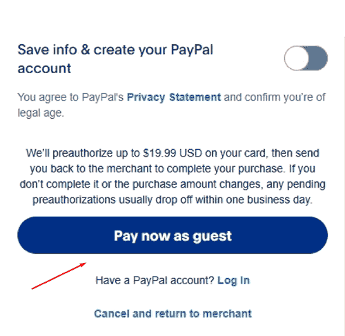 The following Paypal checkout (or similar) will appear with the option to "Pay with a credit or Visa Debit card", "Checkout as guest" or similar. Your credit card / Visa debit payment will be processed by Paypal, but with no Paypal signup required (it will give you the option to sign up if you wish, but to not sign up, simply do not check the "save info and create Paypal account" option. Now, click "Pay now as guest" to complete checkout: